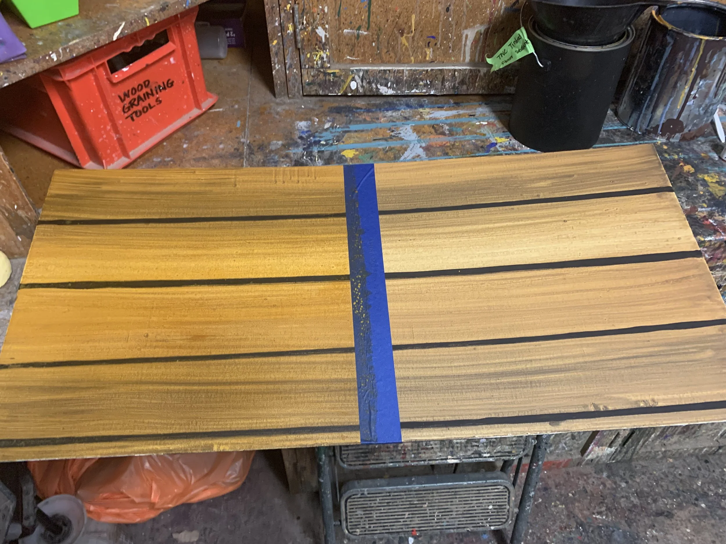 The floor was out biggest challenge of this set. After priming and basing the floor in a pale yellow, we went in with a light tone, mid tone, and dark tone glaze. We pulled the wood colors across the stage in one go, opting to pull the continuous lines of the planks after the wood graining glaze was put down.